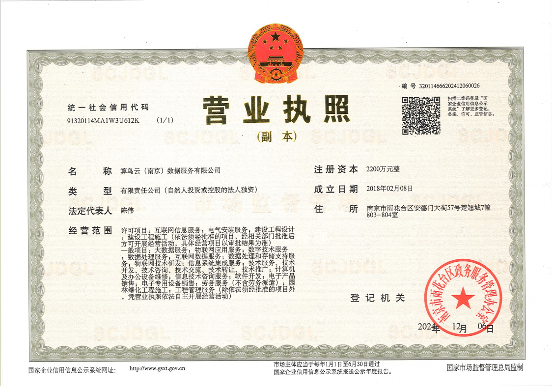 新立訊科技集團全資子公司 “南京新立訊物聯網技術服務有限公司”經國家市場監督管理總局核準,南京市市場監督管局登記備案,正式更名“算鳥云(南京)數據服務有限公司”