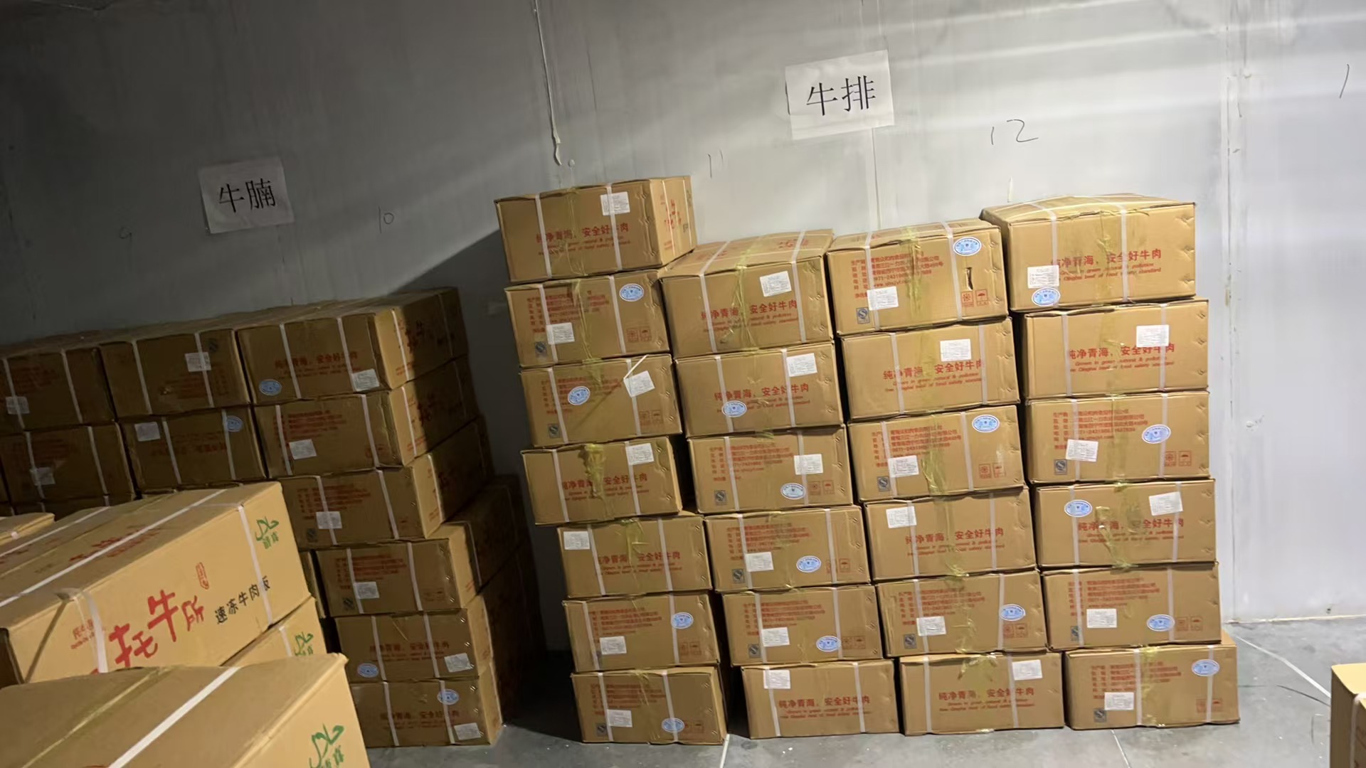 記者隨后來到位于南京市江寧區江寧鎮太康路的倉庫,里面擺放著一排排整齊堆疊的包裝盒,分類標注著牛排、牛腩、牛腱子、羊排等各式產品。現場打包的聲音很大,幾個小伙子忙著搬運配貨,幾輛貨車正在倉庫外等候。