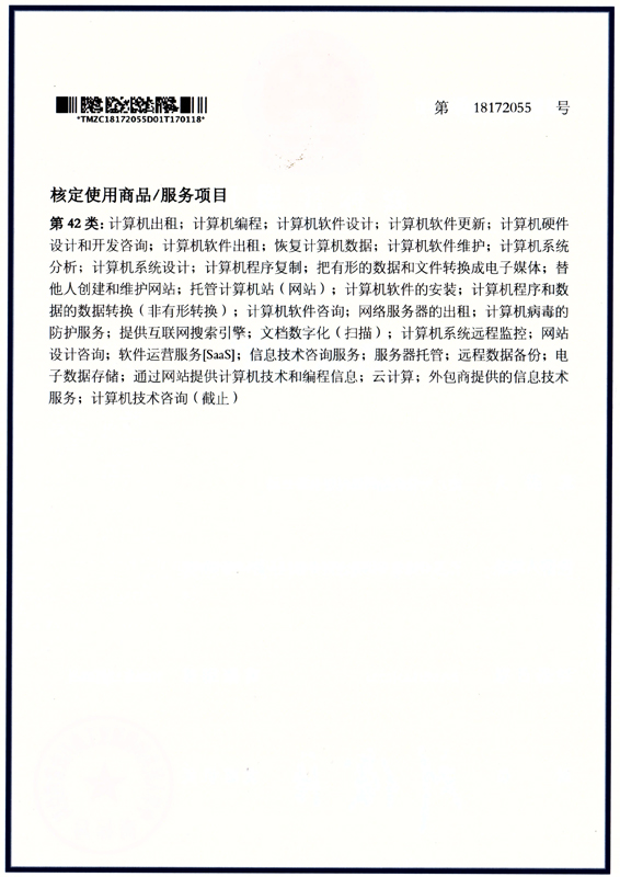 “龜兔賽跑”商標(biāo)注冊號為“18172055”,同時該商標(biāo)明確標(biāo)示核定使用商品/服務(wù)項目共計32項,具體包括:計算機出租;計算機編程;計算機軟件設(shè)計;計算機軟件更新;計算機硬件設(shè)計和開發(fā)咨詢;計算機軟件出租;恢復(fù)計算機數(shù)據(jù);計算機軟件維護;計算機系統(tǒng)分析;計算機系統(tǒng)設(shè)計;計算機程序復(fù)制;把有形的數(shù)據(jù)和文件轉(zhuǎn)換成電子媒體;替他人創(chuàng)建和維護網(wǎng)站;托管計算機站(網(wǎng)站);計算機軟件的安裝;計算機程序和數(shù)據(jù)的數(shù)據(jù)轉(zhuǎn)換(非有形轉(zhuǎn)換);計算機軟件咨詢;網(wǎng)絡(luò)服務(wù)器的出租;計算機病毒的防護服務(wù);提供互聯(lián)網(wǎng)搜索引擎;文檔數(shù)字化(掃描);計算機系統(tǒng)遠程監(jiān)控;網(wǎng)站設(shè)計咨詢;軟件運維服務(wù)[SaaS];信息技術(shù)咨詢服務(wù);服務(wù)器托管;遠程數(shù)據(jù)備份;電子數(shù)據(jù)存儲;通過網(wǎng)站提供計算機技術(shù)咨詢。